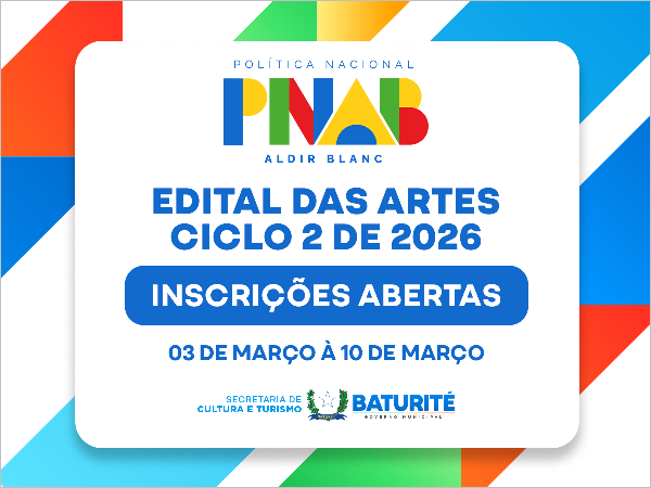 A Secretaria de Cultura e Turismo de Baturité informa que estão abertas as inscrições para o Primeiro Edital das Artes 01/2026 da Política Nacional Aldir Blanc Ciclo II